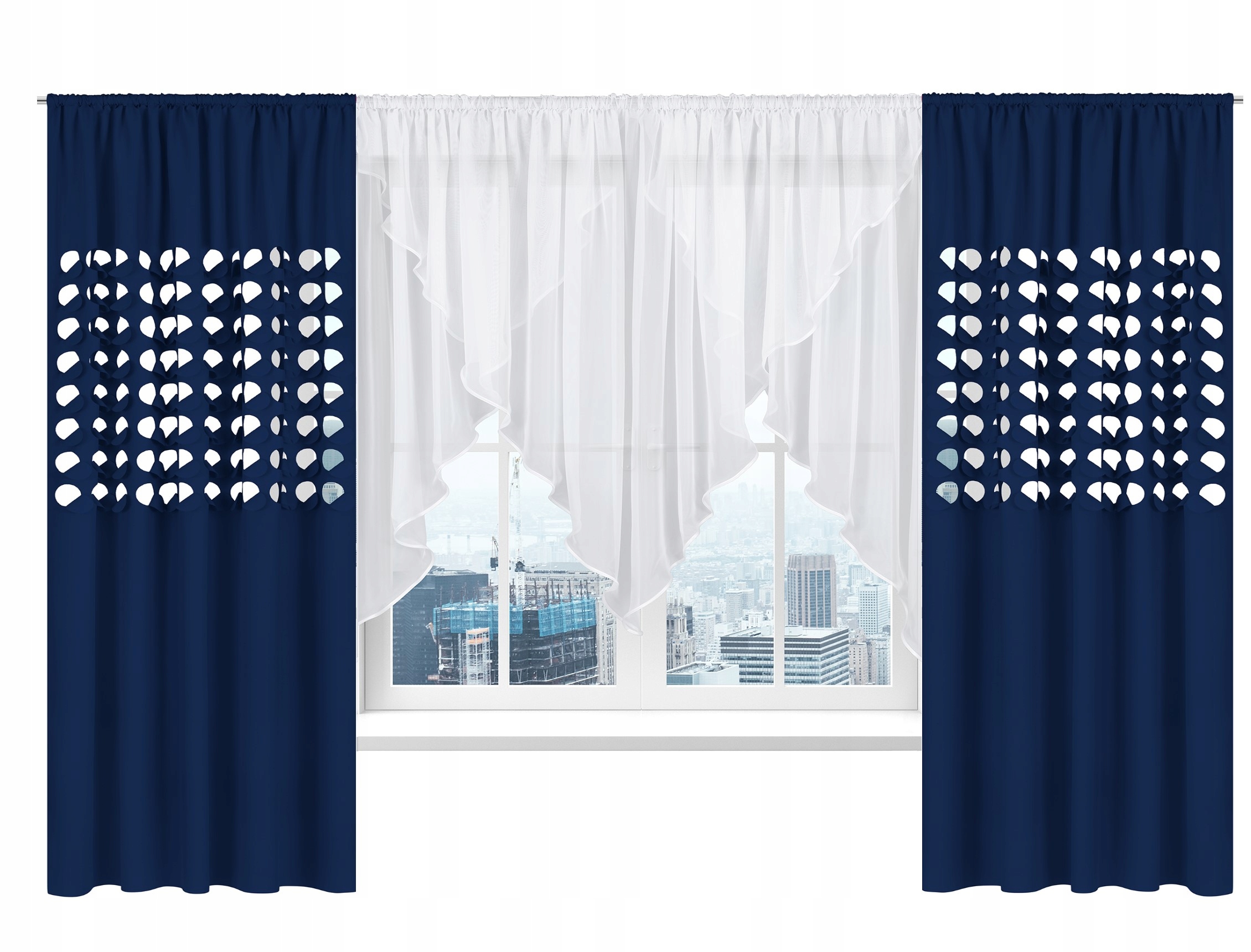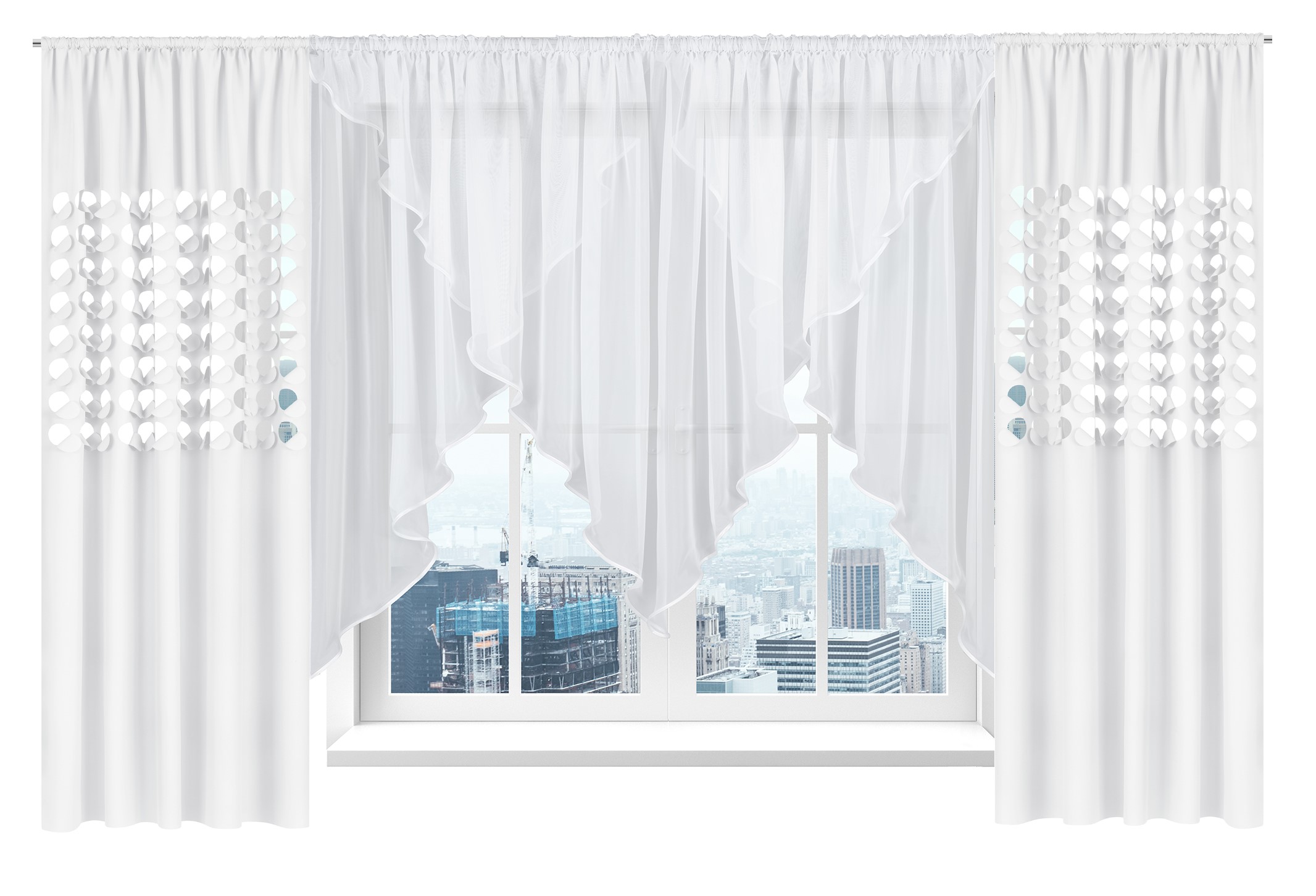 - W skład zestawu wchodzą dwie zasłony, firana z woalu białego gładkiego.