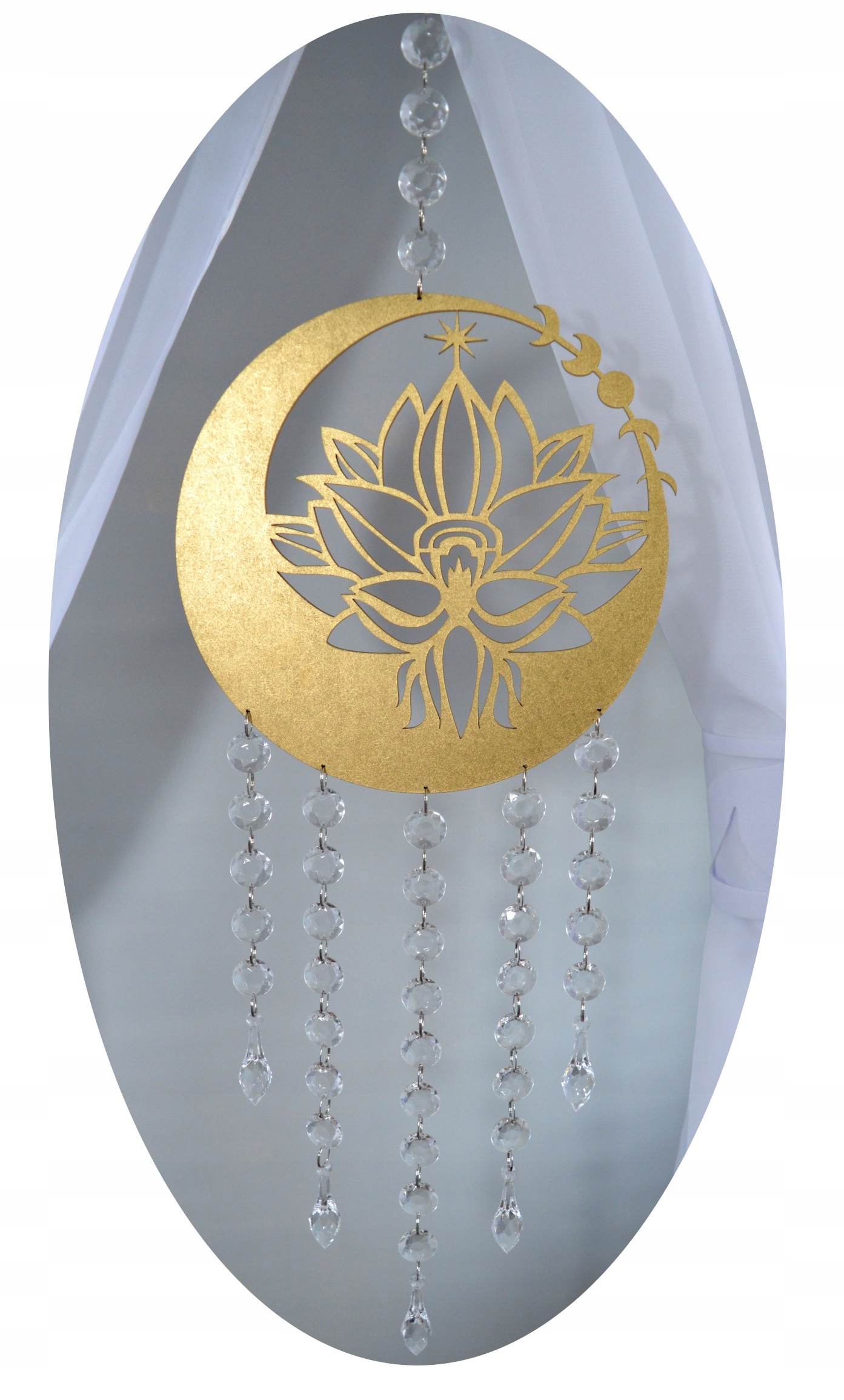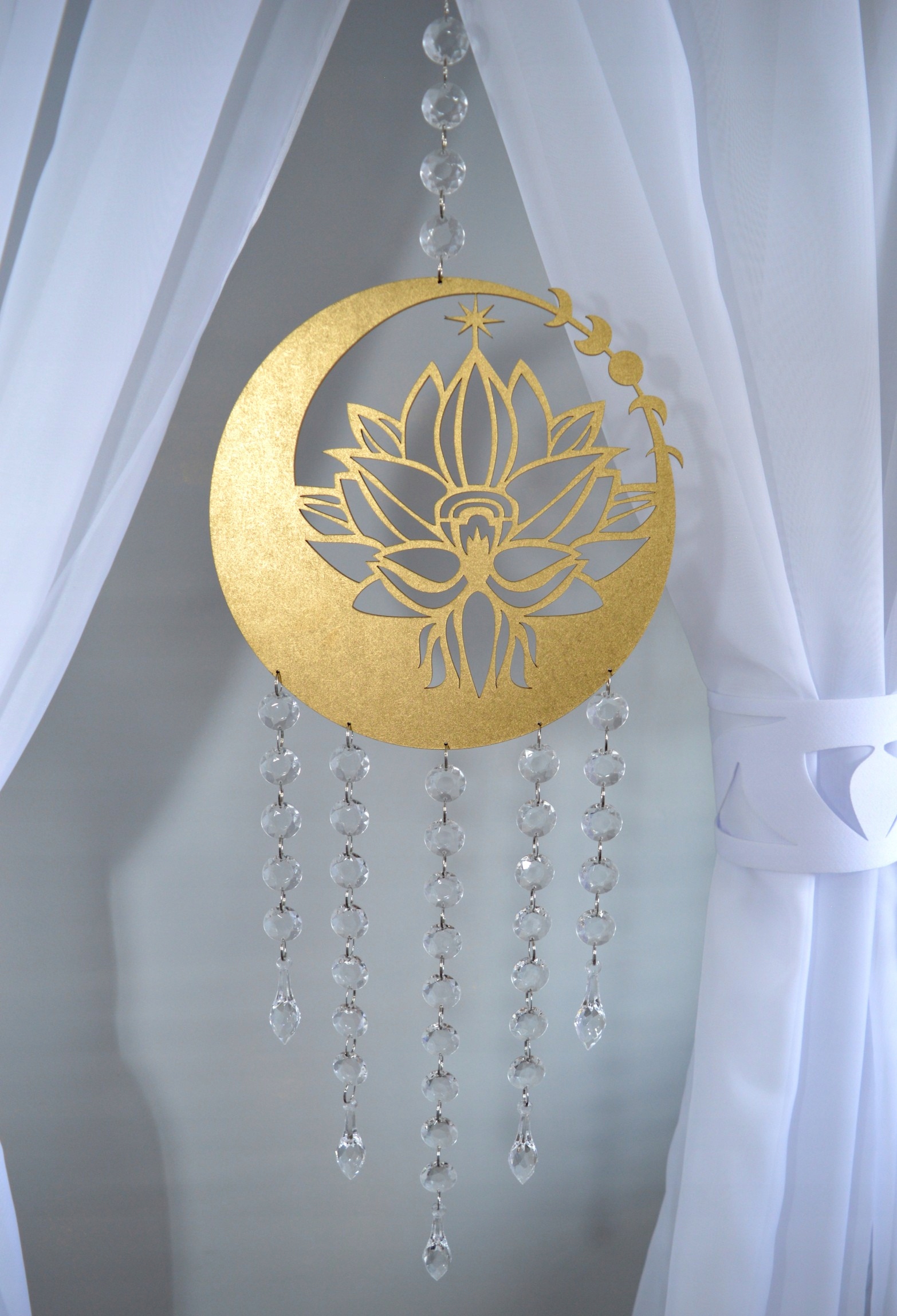 Subtelna i harmonijna zawieszka do okna, przedstawiająca symboliczny motyw kwiatu lotosu wpisanego w kształt złotego półksiężyca z gwiazdą. Wykonana z precyzyjnie ciętej płyty HDF, ręcznie malowanej na elegancki złoty kolor, który pięknie odbija światło dzienne oraz sztuczne oświetlenie.